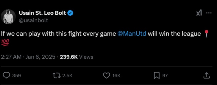 博爾特寫道:“如果我們每場比賽都能踢出這樣的斗志,曼聯(lián)就會贏下聯(lián)賽冠軍。