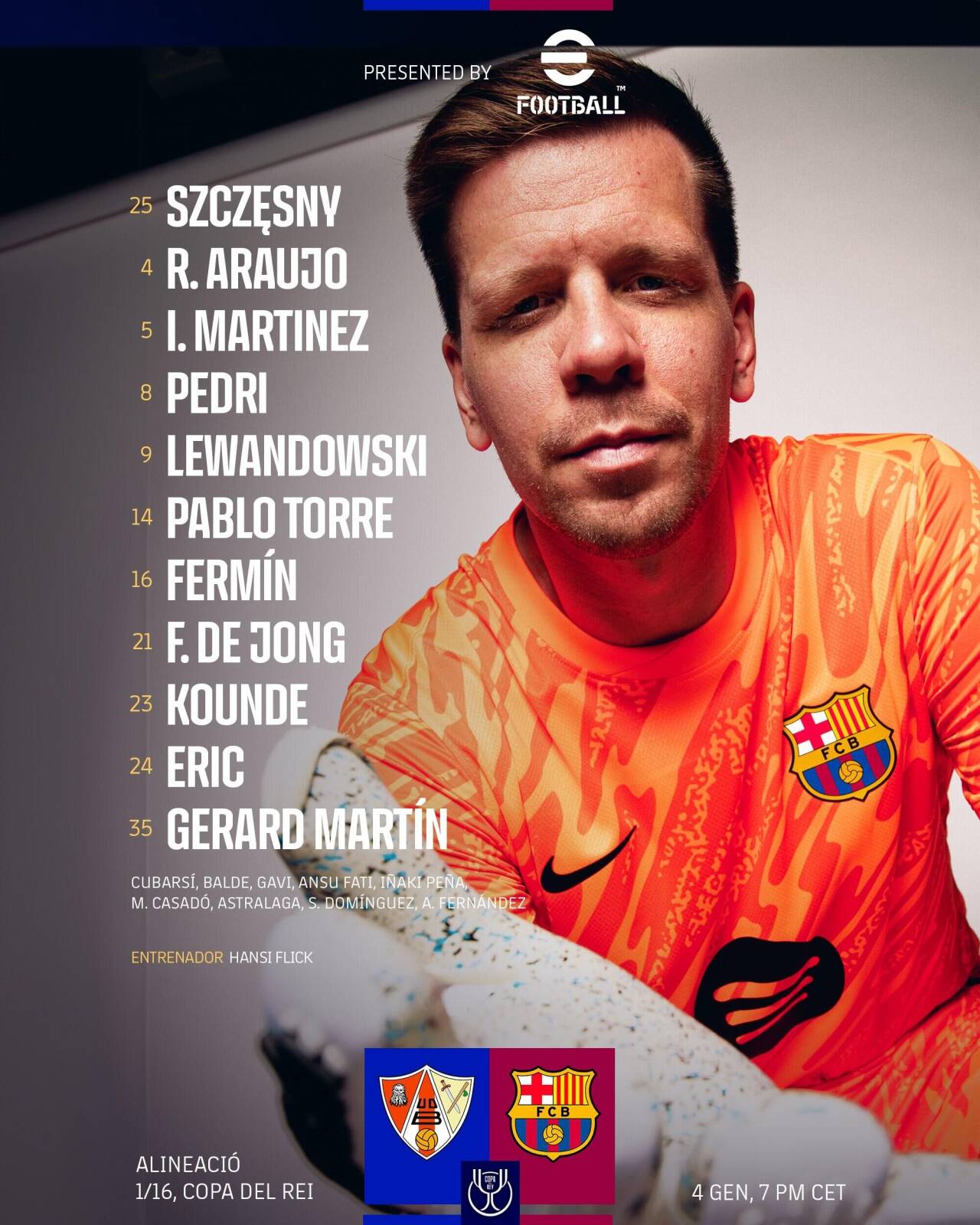 巴薩替補(bǔ):13-佩尼亞、26-阿斯特拉拉加、2-庫巴西、3-巴爾德、6-加維、10-法蒂、17-卡薩多、36-多明戈斯、42-A-費(fèi)爾南德斯
