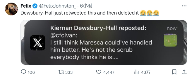 在社媒上,有球迷發(fā)文表示:我還是覺得馬雷斯卡可以更好地使用霍爾,他不像大家想象的那樣差。