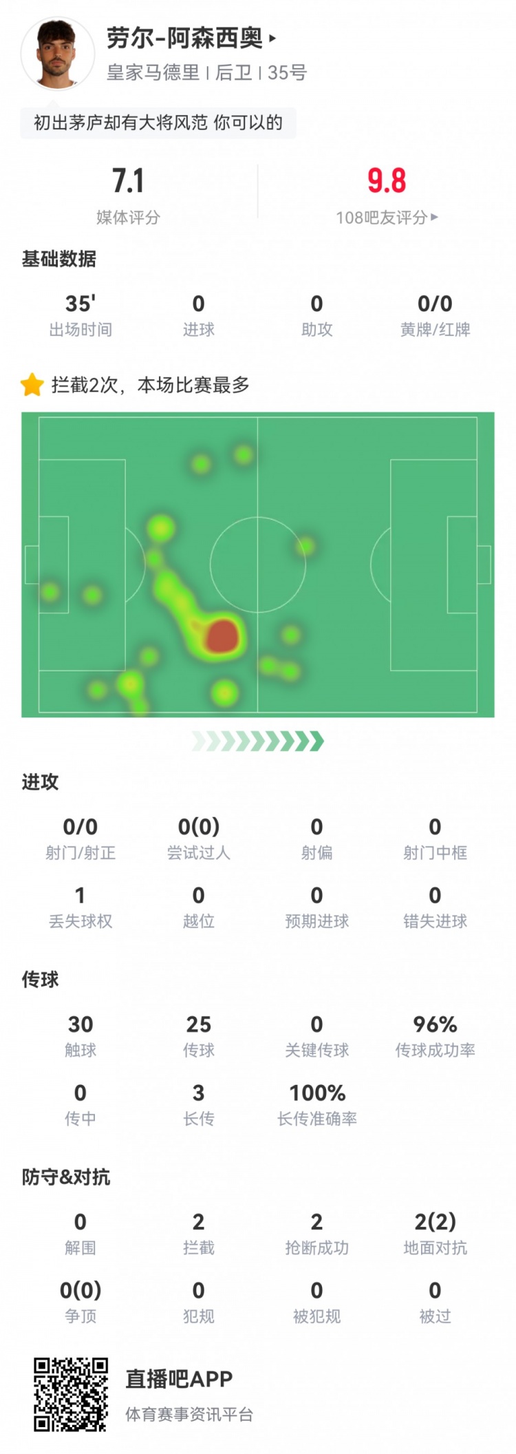 直播吧1月10日訊 西超杯半決賽,皇馬3-0馬洛卡晉級(jí)決賽將戰(zhàn)巴薩。此役皇馬21歲中衛(wèi)勞爾-阿森西奧替補(bǔ)登場(chǎng)35分鐘表現(xiàn)出色,球員全場(chǎng)重點(diǎn)數(shù)據(jù)如下↓