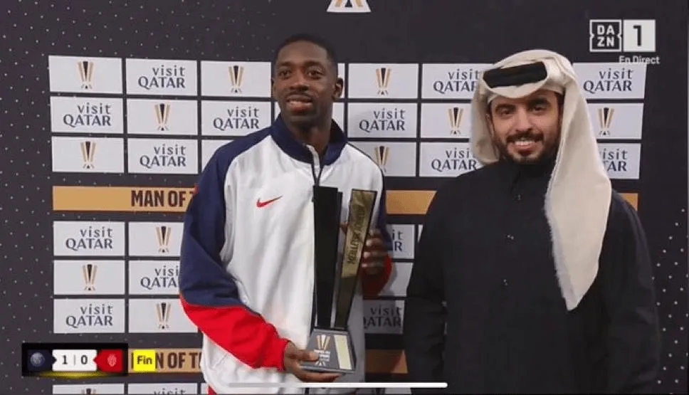 直播吧1月6日訊 本賽季法國超級杯決賽落幕,巴黎1-0絕殺摩納哥奪得冠軍。賽后,打入制勝球的登貝萊當選全場最佳球員。