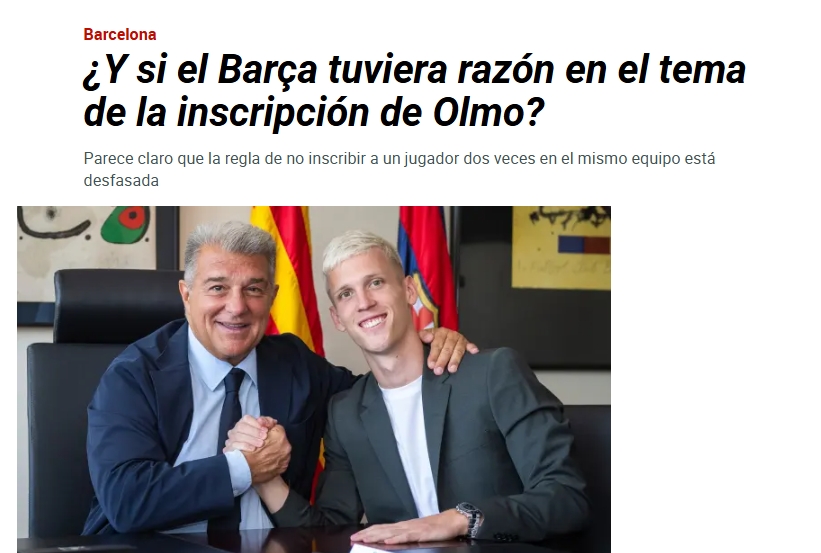 《馬卡報(bào)》標(biāo)題為“如果關(guān)于奧爾莫注冊(cè)一事巴薩是對(duì)的怎么辦?”,認(rèn)為球員不得在同一球隊(duì)兩次注冊(cè)的規(guī)則已經(jīng)過時(shí)。
