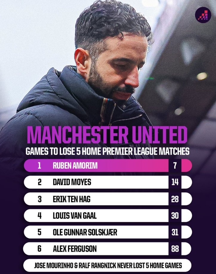 直播吧2月3日訊 在本輪英超,曼聯(lián)0-2不敵水晶宮,阿莫林執(zhí)教球隊7個英超主場輸?shù)?場。